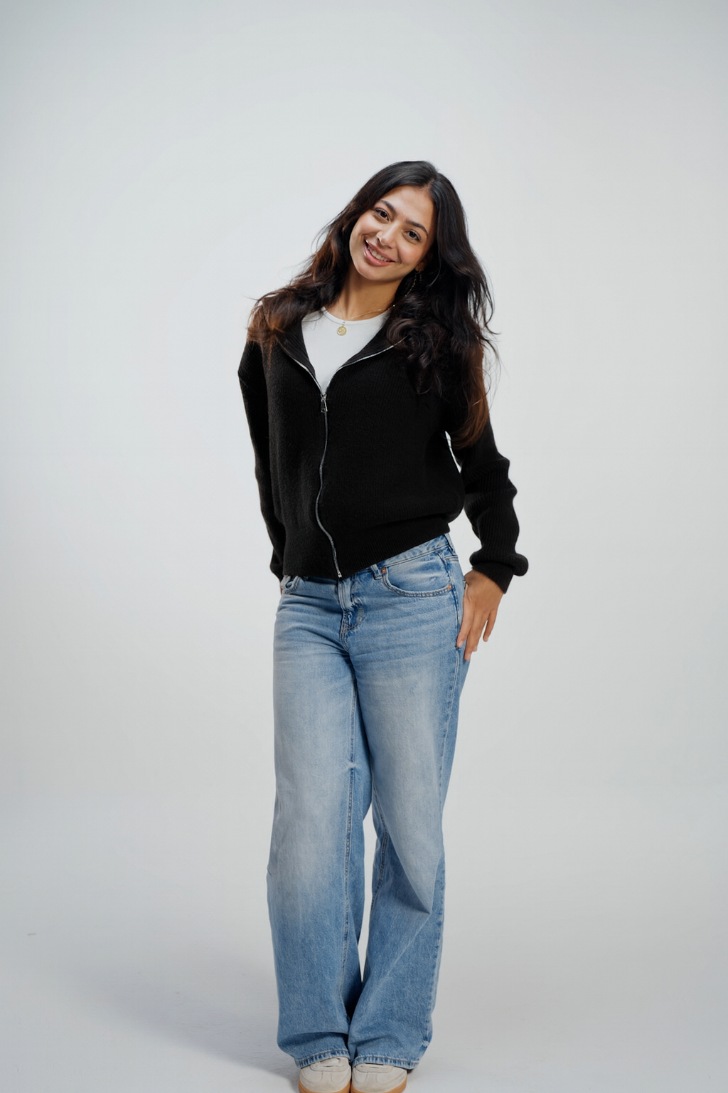 This black knit jacket brings warmth and style together. The long, flexible neck spreads naturally over the shoulders for a soft, relaxed look. Close the jacket, and the neck rises into a high-neck silhouette that keeps you cozy on colder days. With its comfortable fit and elegant winter vibe, it’s perfect for everyday wear and effortless layering.