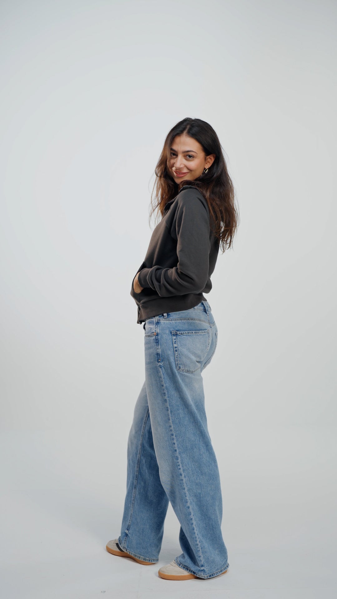 The Grey French Jacket sits at the waist with a clean, modern fit. The long neckline rests softly across the shoulders for a sculpted look, while two oversized pockets add both style and practicality. Made from smooth French terry, it delivers comfort and effortless everyday chic.